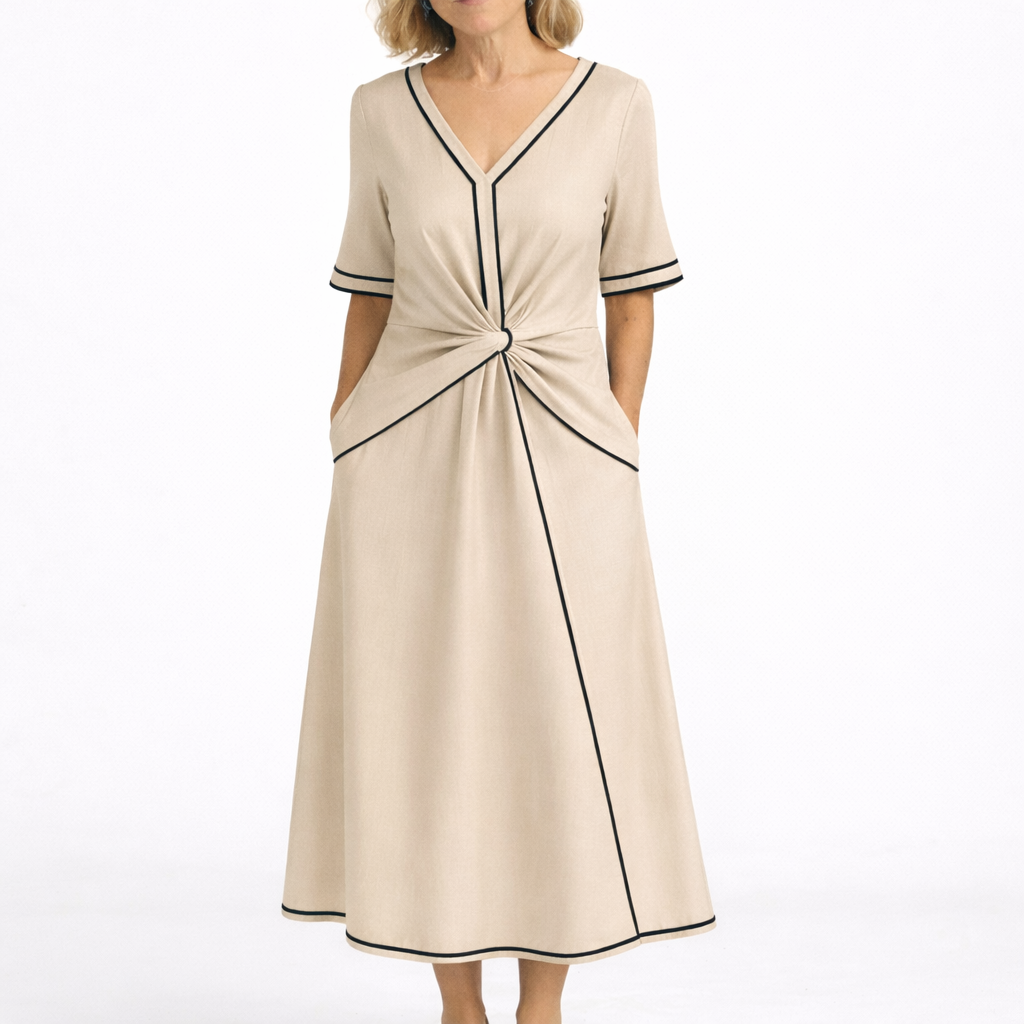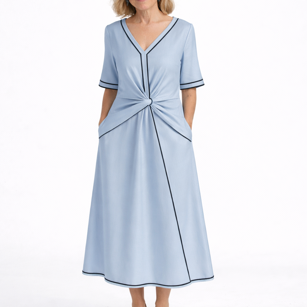 Viveca är en klänning för kvinnor som vill känna sig bekväma och välklädda varje dag. Den stilrena designen med subtila kontrastdetaljer ger ett elegant och sofistikerat uttryck som passar lika bra till vardag som till mer uppklädda tillfällen.